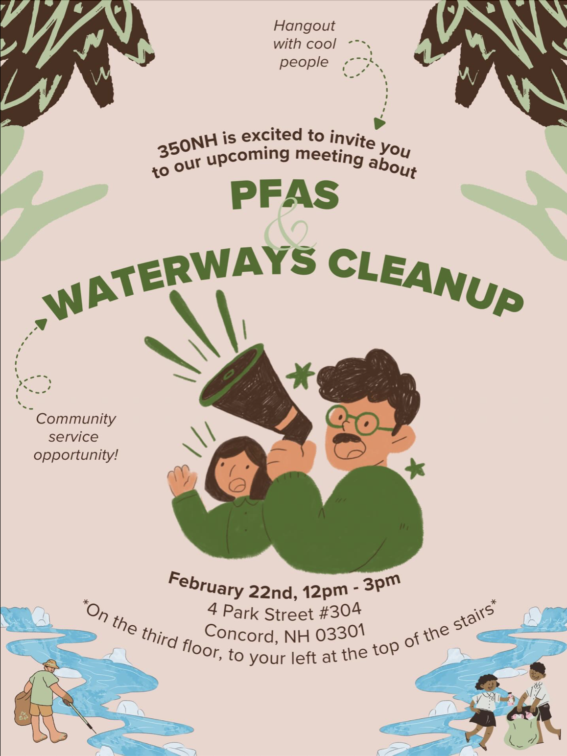 Youth Team In Person Meeting Sunday, February 22, 2026 12:00 PM 3:00 PM Google Calendar ICS Join the 350NH Youth team for an afternoon of food, t-shirt decorating, and learning about our campaign to get PFAS out of the granite state. Email pat@350nh.org for more details about how to join!